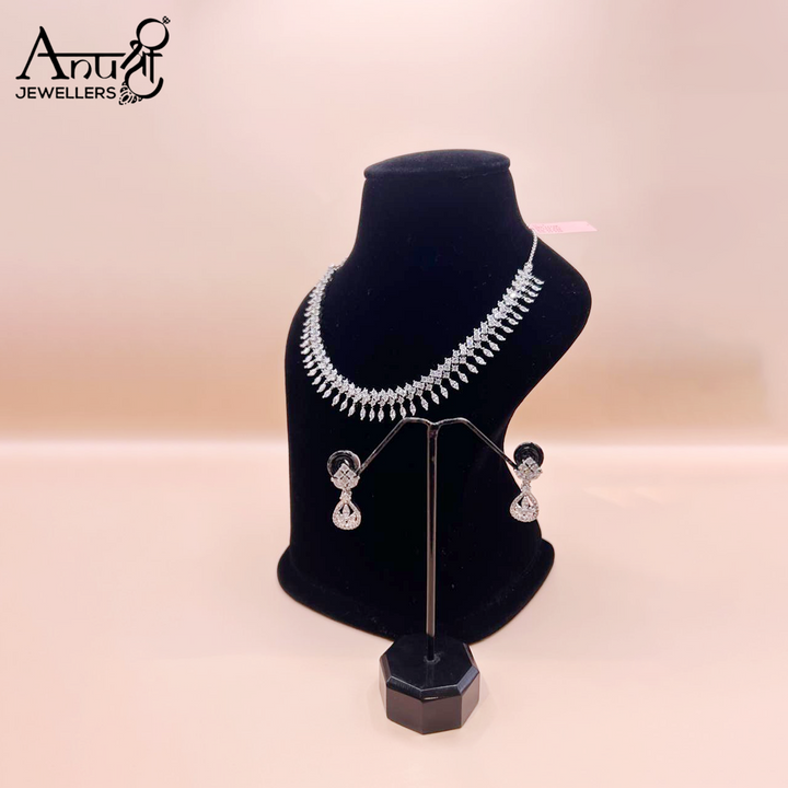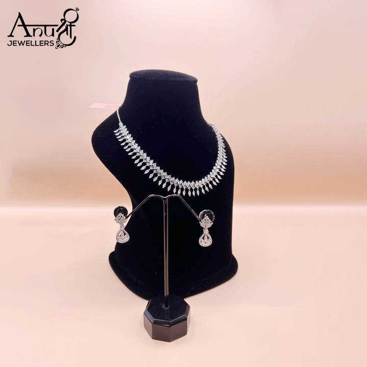 This is a stunning contemporary silver necklace and earring set with an antique finish. The necklace features diamond-cut elements in unique shapes, centered by a teardrop motif. The set, with a total weight of 44.630 grams, offers a bold, modern take on traditional fine jewelry.