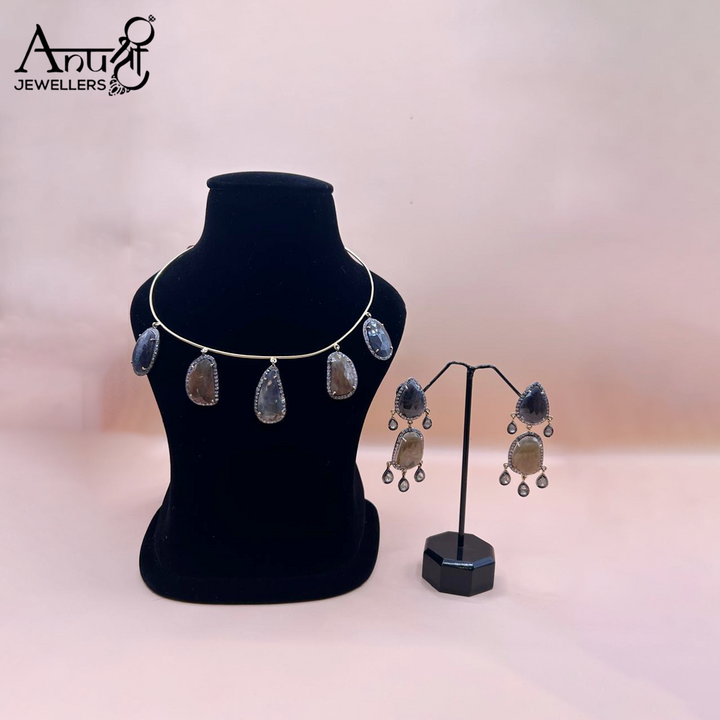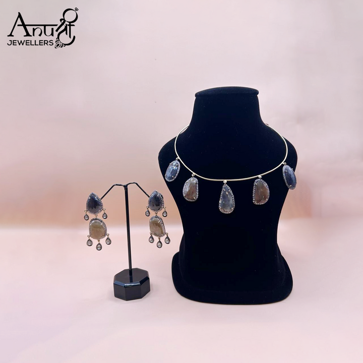 This is a sparkling silver necklace and earring set that features a dramatic, bib-like front section composed of numerous stones. The stones are set in a rhythmic pattern, creating a tiered fringe effect. The entire set, weighing 51.860 grams, is a striking and elegant contemporary piece, perfect for formal evening events.