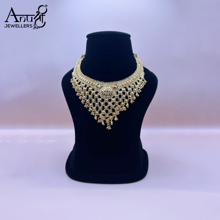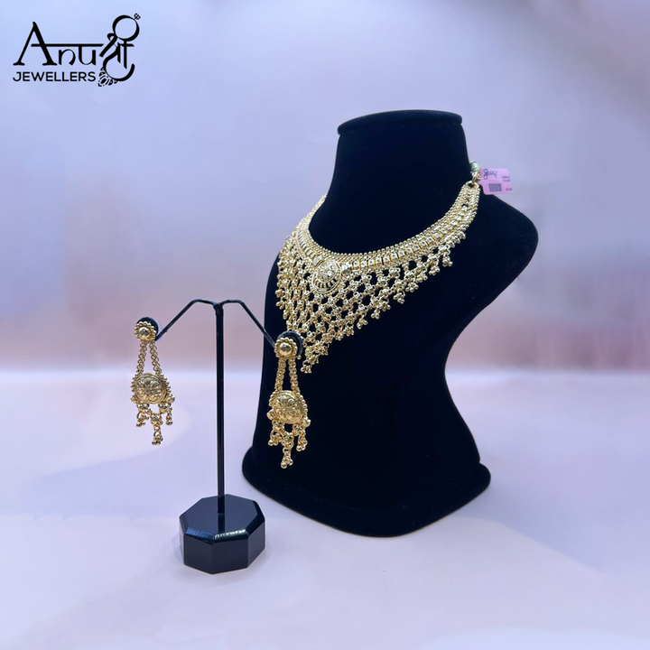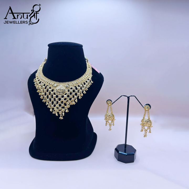 This is a traditional gold-toned necklace and earring set with an intricate, web-like choker design composed of numerous linked elements, leading to a central circular motif. The set, weighing 57.960 grams, offers a classic, elaborate look for festive or ceremonial occasions.